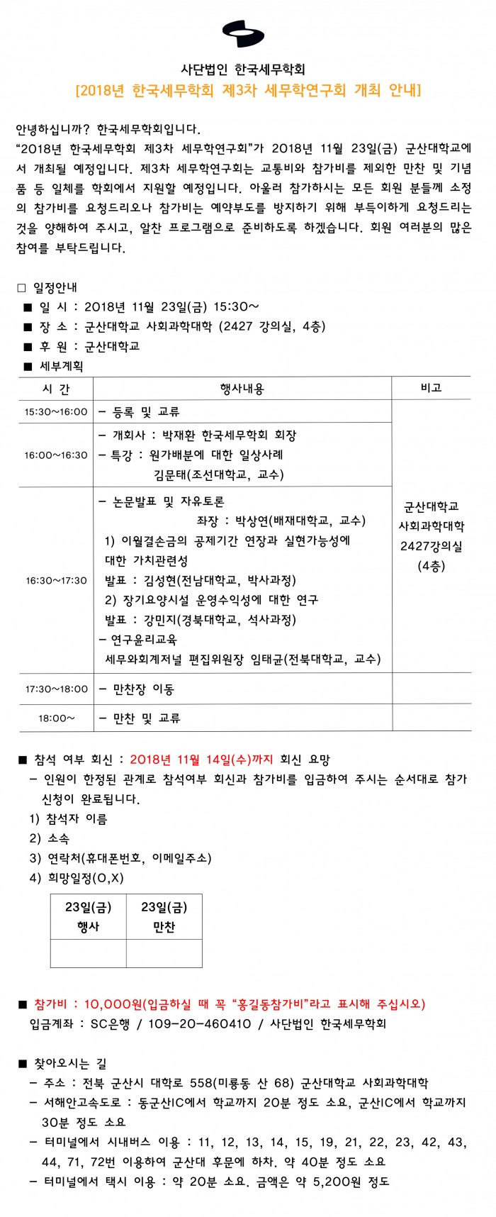 2018년 제3차 세무학연구회 개최 일정안내(11/23, 군산대)