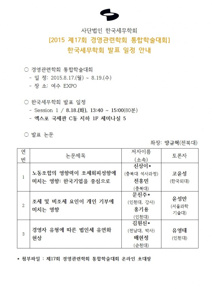 2015 제17회 경영관련학회 통합학술대회 한국세무학회 세션공지(8/18) 한국세무학회 0 11,532 2015.07.17 12:40 첨부파일 - 첨부파일: 제17회 하계통합학술대회 e-DM.html (6.3K) 12 2015-07-17 12:40:06 목록 본문