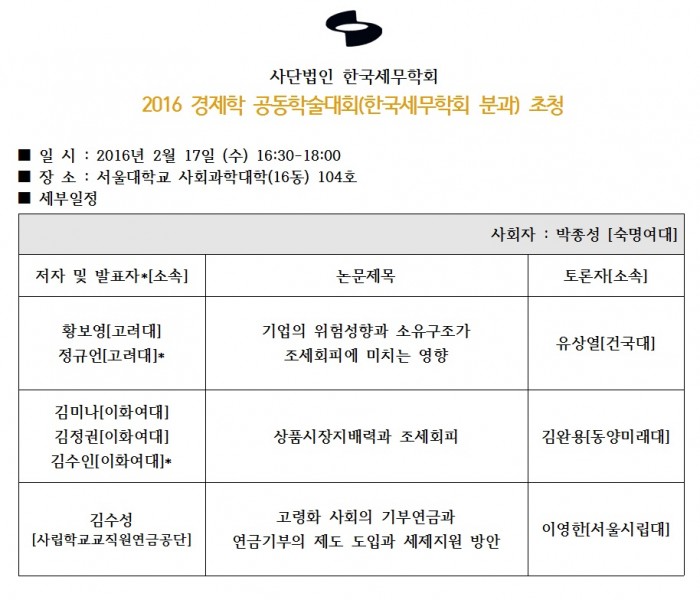 2016 경제학 공동학술대회 한국세무학회 분과 초청 한국세무학회 0 9,977 2016.01.19 11:59 첨부파일 - 첨부파일: 2016 Program(2016경제학공동학술대회).pdf (2.9M) 6 2016-02-01 12:02:12 목록 본문