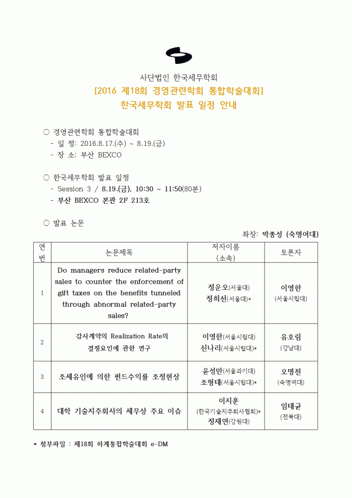 2016 제18회 경영관련학회 통합학술대회 한국세무학회 발표 일정 안내 한국세무학회 0 8,608 2016.07.14 15:14 첨부파일 - 첨부파일: 제18회 하계통합학술대회 e-DM.html (2.8K) 8 2016-07-14 15:16:32 목록 본문