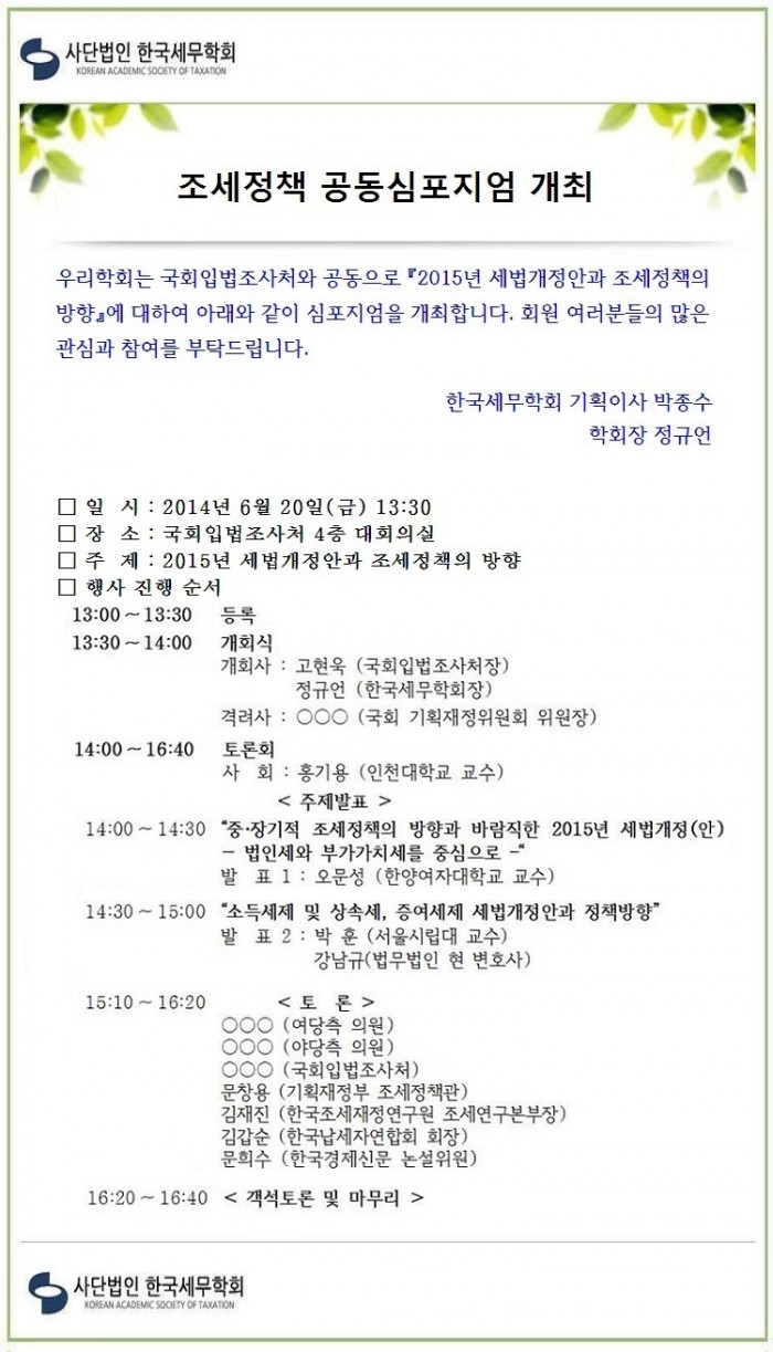 조세정책 공동 심포지엄 개최 공지(6/20, 국회입법조사처)