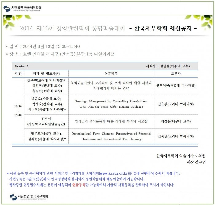 2014 제16회 경영관련학회 통합학술대회 한국세무학회 세션공지(8/19)