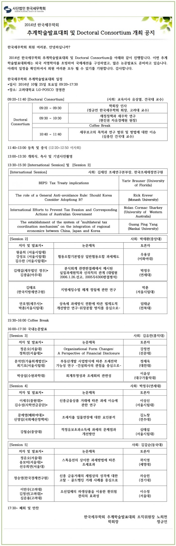 [한국세무학회]2014년 한국세무학회 추계학술발표대회 및 Doctoral Consortium 개최공지