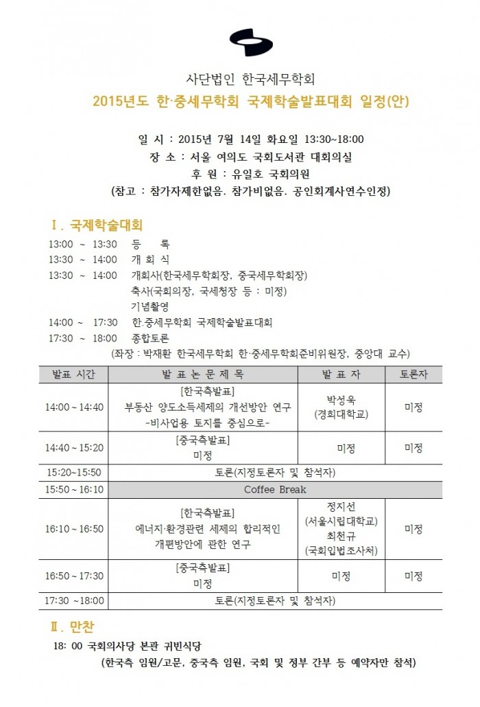 [한국세무학회]2015년도 한중세무학회 국제학술발표대회 일정(안) 안내
