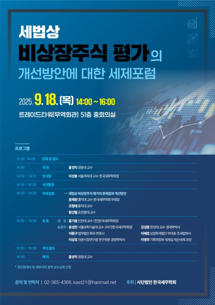 세법상 비상장주식 평가의 개선방안에 대한 세제포럼 개최 안내 한국세무학회_ 0 364 2025.09.03 12:20 첨부파일 - 첨부파일: 포스터.jpg (304.1K) 0 2025-09-10 13:26:20 목록 본문